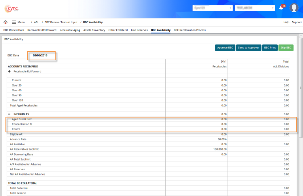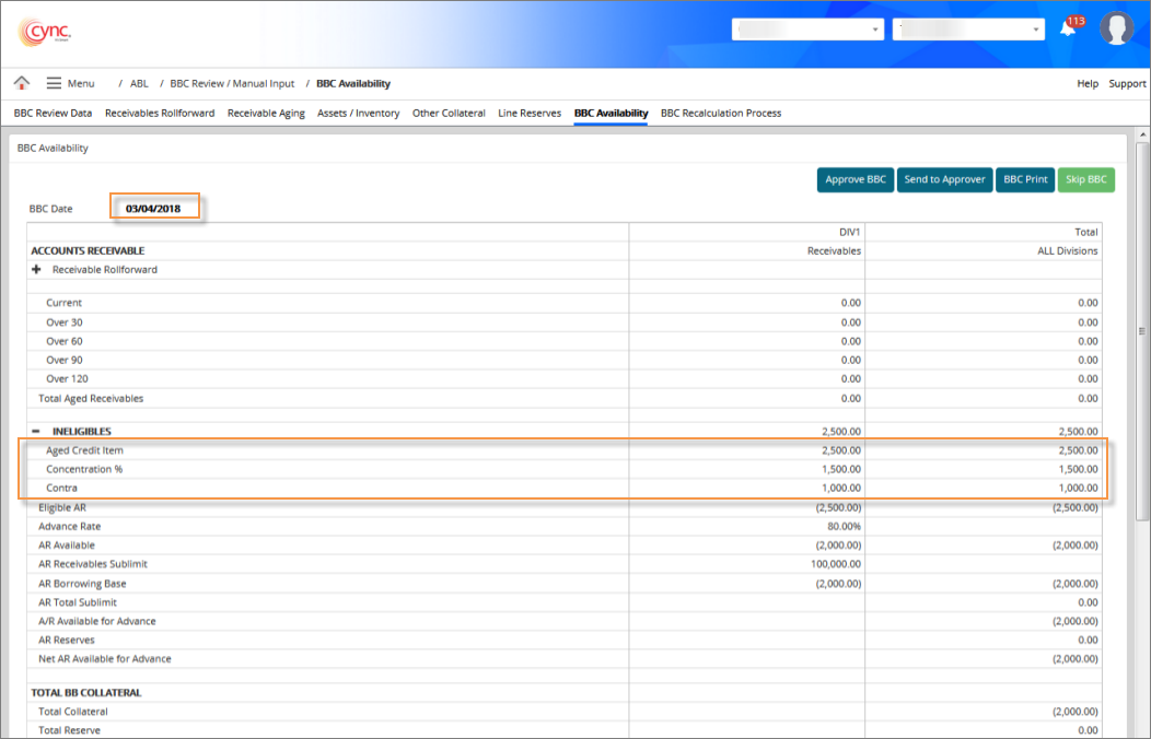 This value is independent of Manual BBC and the value has no dependency on Receivable Rollforward and aging overwrite options. The value is considered as eligible value and is not considered while calculating ineligible.