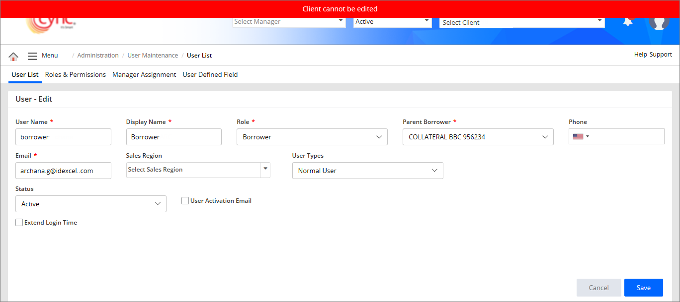 If a user tries to edit the Parent Borrower while editing the existing user account, then the system shows an error notification.