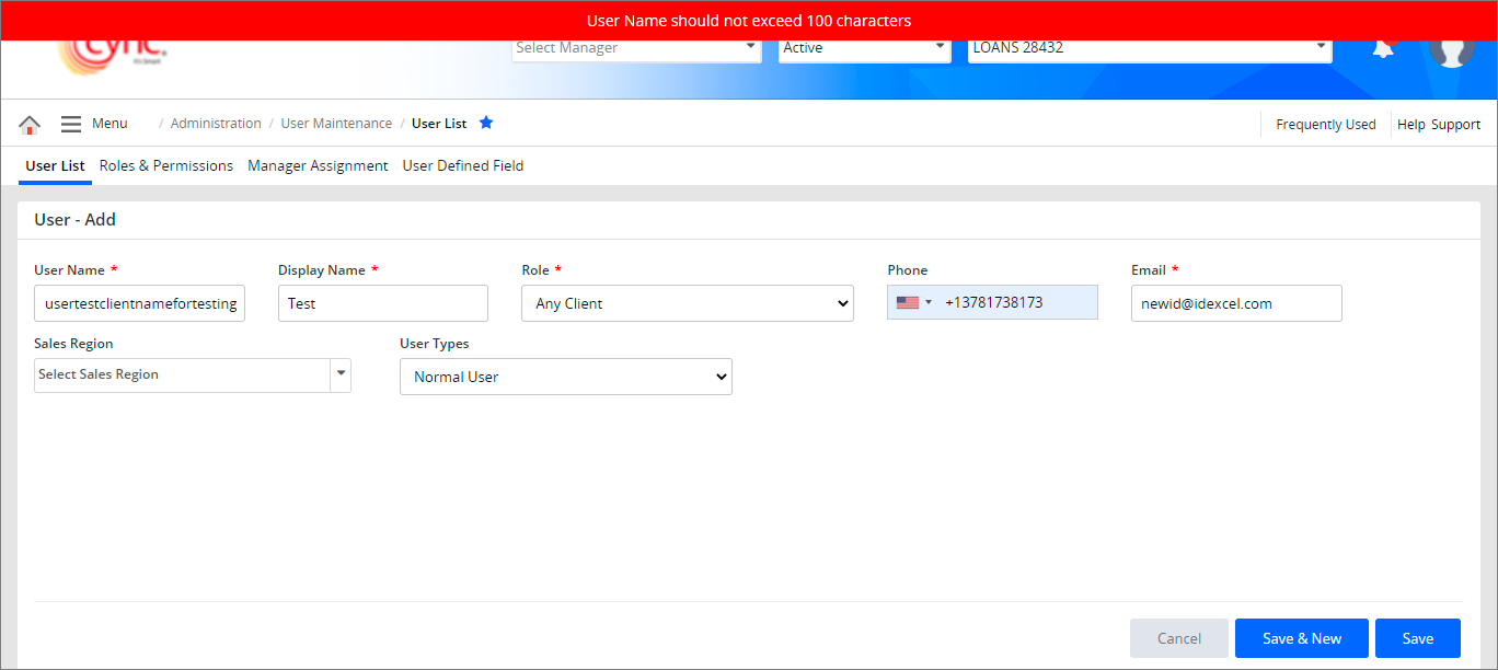 If a user enters more than 100 characters in the User Name field while creating a new user account or editing the existing user account, the system shows an error notification.