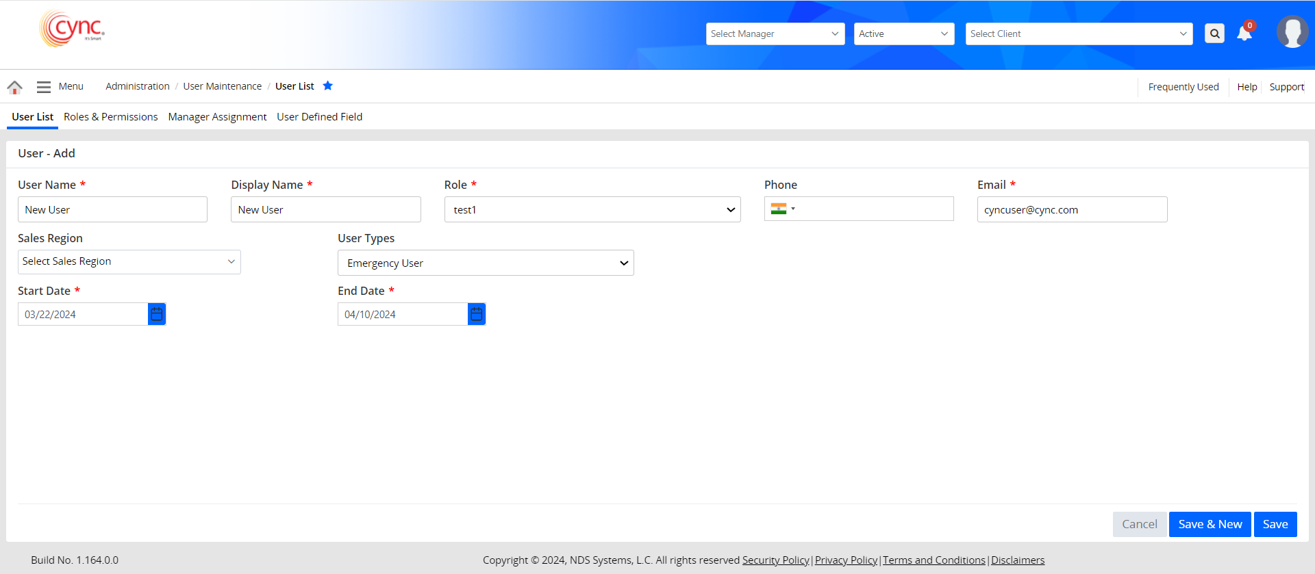 8. In the Sales Region field, select the sales region that the user would be dealing in from the dropdown list.
