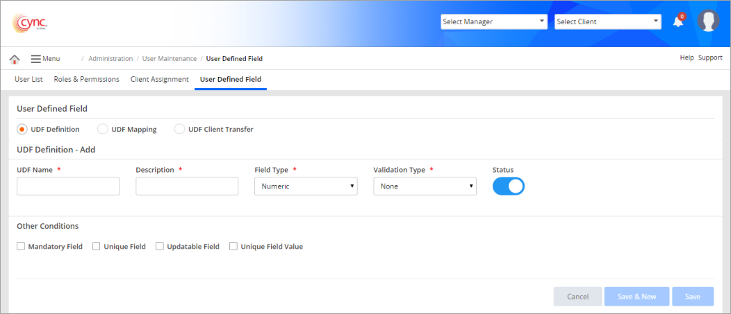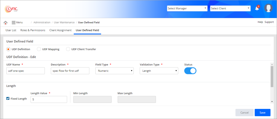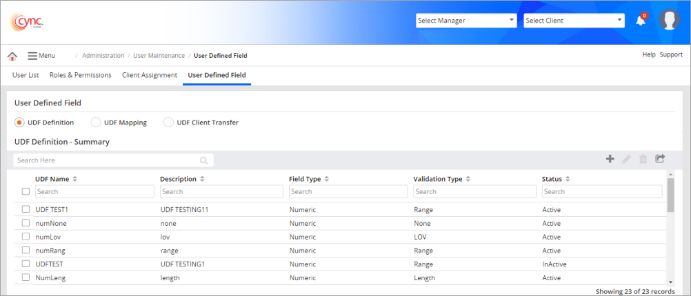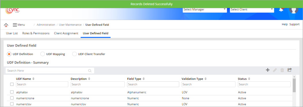 Users can create new UDF. Users can edit and delete existing UDF/s. Users can also create numeric and alphanumeric UDF/s.