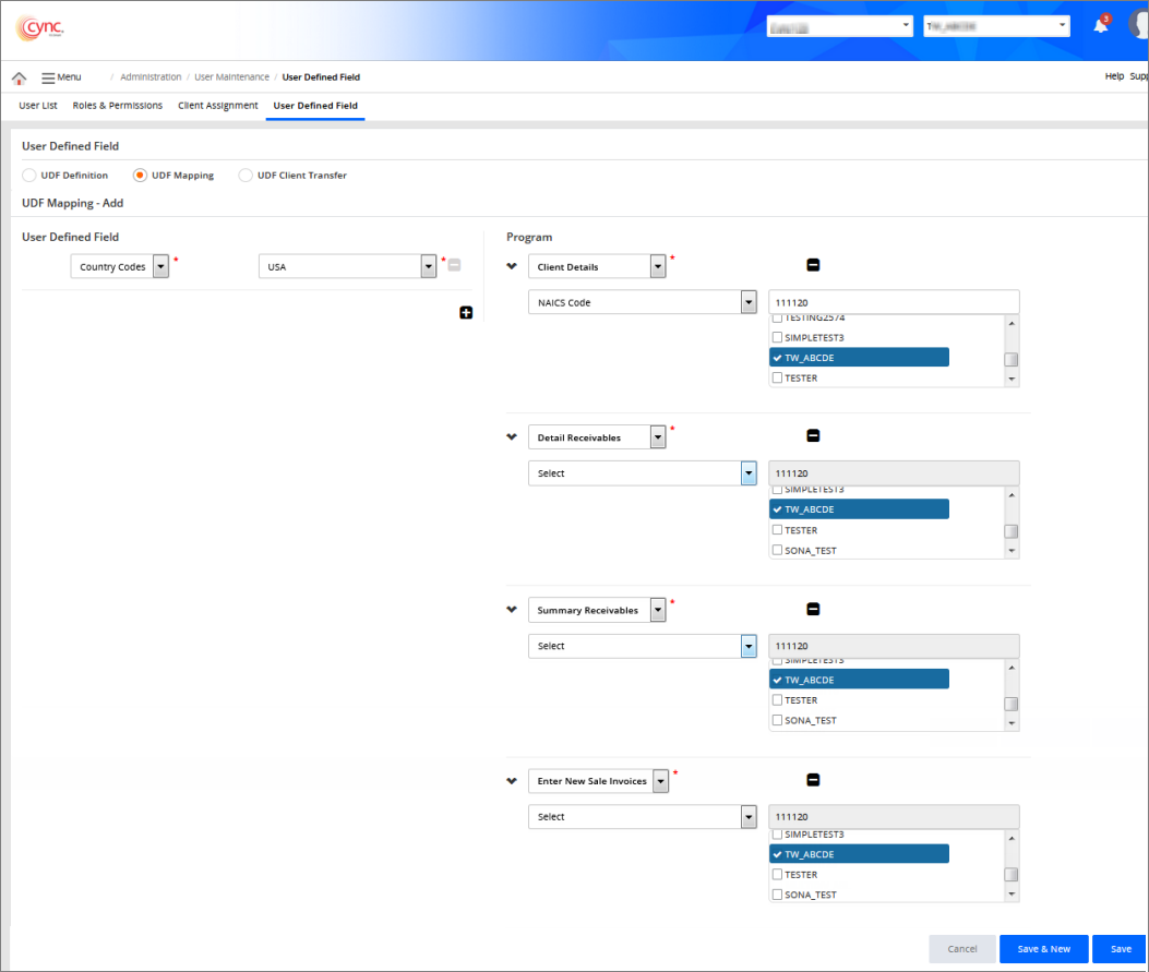 Administration / User Maintenance / User Defined Field / UDF Mapping