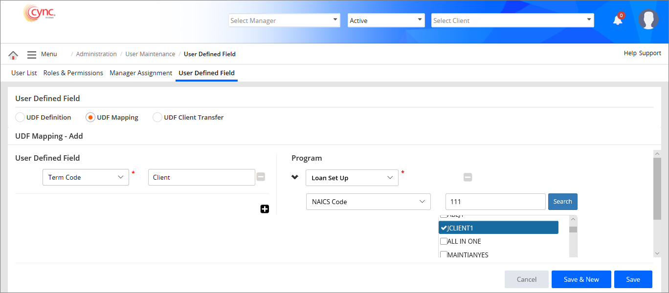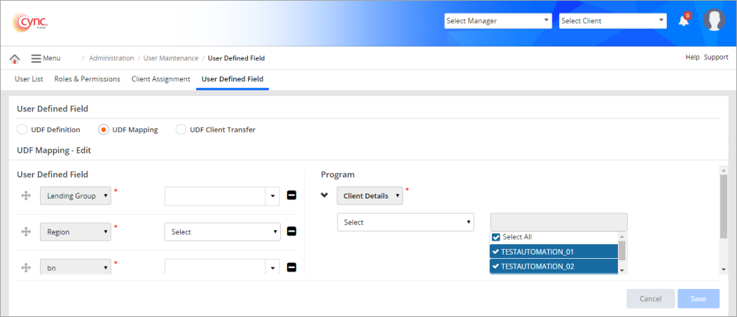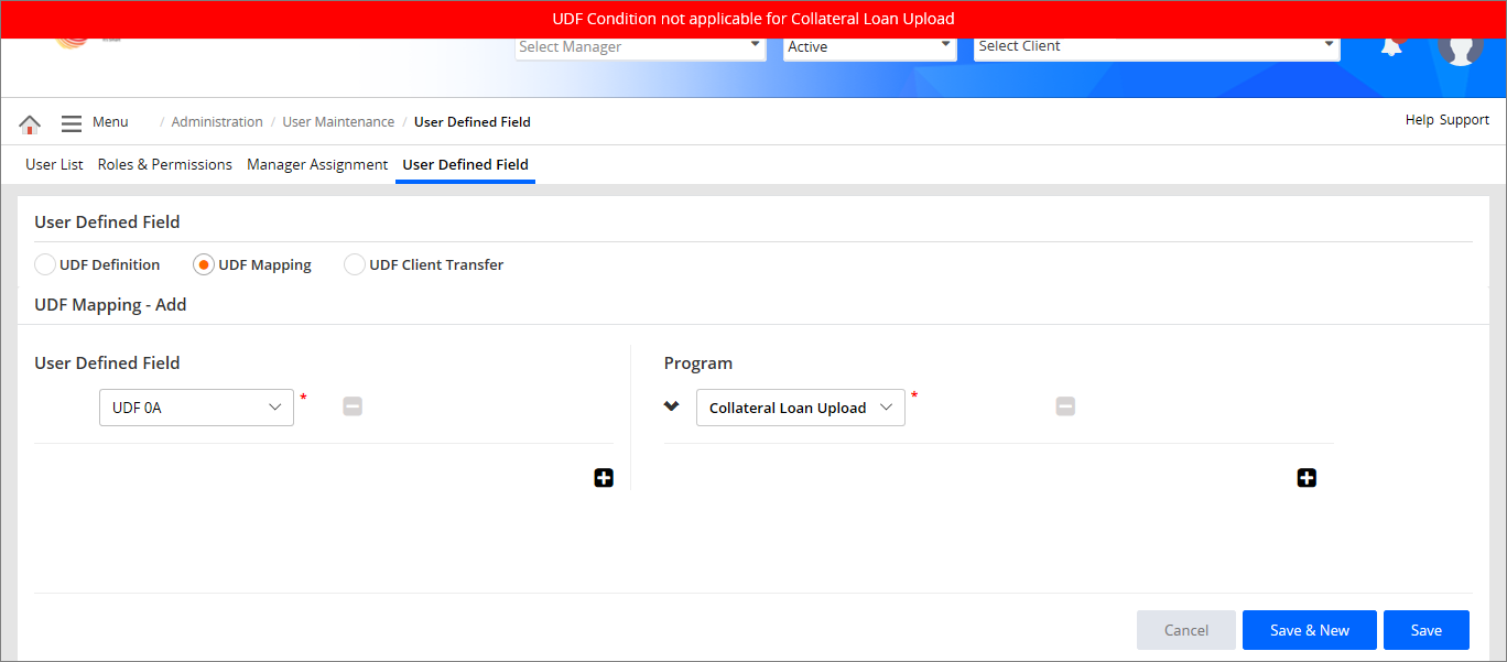 If the user maps the UDF to the Collateral Loan Upload Program without mapping it with the Basic Client Details Program, the system shows an error notification UDF needs to be mapped to Basic Client Details program to be mapped to Collateral Loan Upload Program’.
