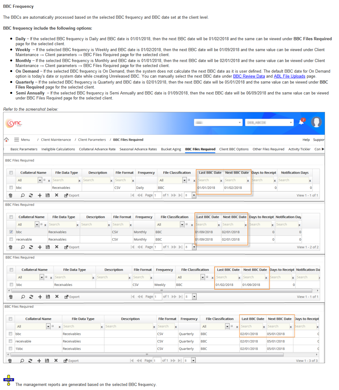 The BBCs are automatically processed based on the selected BBC frequency and BBC date set at the client level. The same is reflected in management reports such as BBC Trend Report, BBC Executive Trend Report, Collateral Analysis Report, Ineligible Trend Report, and BBC Management Report.