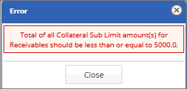 Specifies an sub limit amount of a collateral to charge. The sublimit value for the specific collateral type should be defined lesser than the sublimit cap defined under Basic Parameters page. If the value exceeds, an error message appears. Refer to the screenshot: |