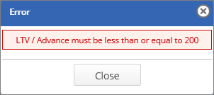 Specifies the advance for the collateral. The maximum LTV/Advance value limit is 200%. If the value exceeds, an error message appears. Refer to the screenshot: |