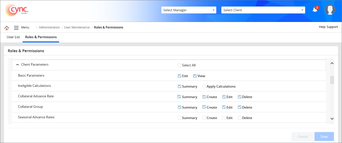 The system displays the Collateral Group section based on the setting done under Roles and Permissions page. The Collateral Group flags are enabled to check ON only if the Collateral Advance Rate flags are checked ON under Roles and PermissionsRoles and Permissions page.