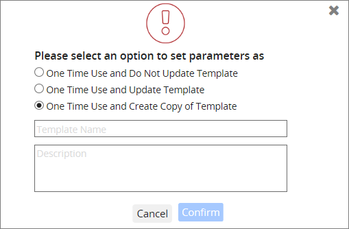 One Time Use and Do Not Update Template – If selected, the updated/modified parameters are assigned to the selected client’s parameters only in client level as an one time use and will not be stored in a template level.
