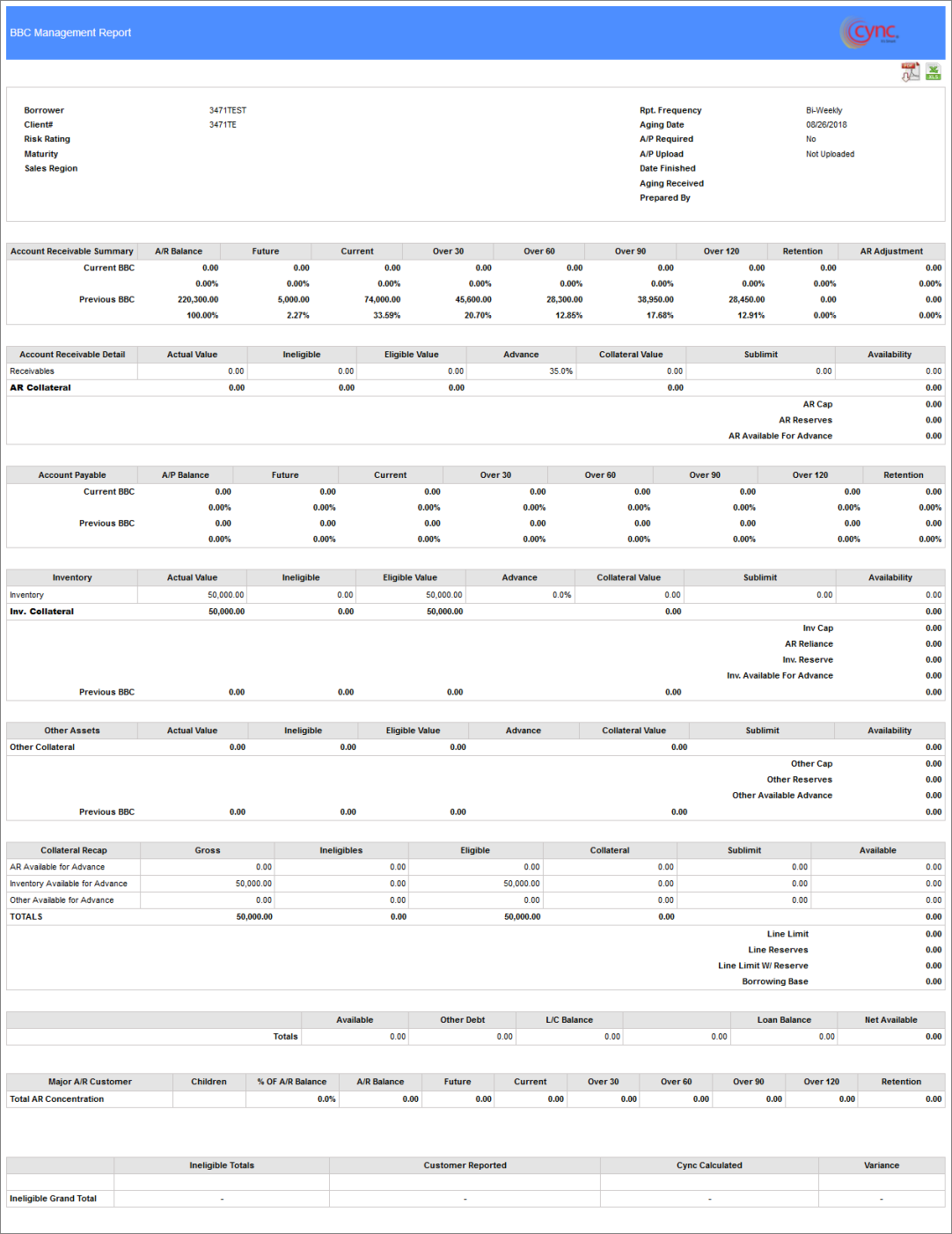 The BBC Management Report shows the details of the BBC availability for a particular client selected. This includes the summary of Accounts receivable (Detail and Summary), Accounts payable, Inventory, Other collateral, Collateral Recap, and Client's ineligible summary.